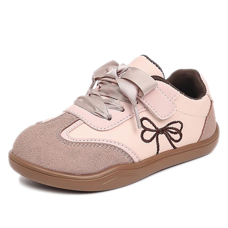 Кроссовки для девочек весна-осень, милые детские теннисные туфли с вышитым бантом, модная нескользящая школьная универсальная детская повседневная обувь 23 розовый