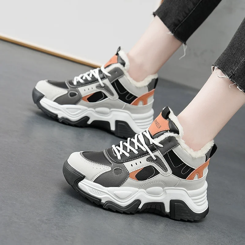 Кроссовки женские на толстой подошве, Повседневная теплая плюшевая обувь, меланхоли, на шнуровке, с круглым носком, на толстой подошве, на зи...