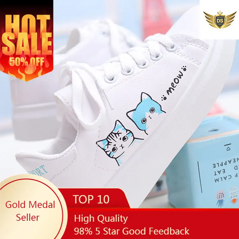 Кроссовки женские на шнуровке, Вулканизированная подошва, милый кот, Повседневная модная обувь, белые