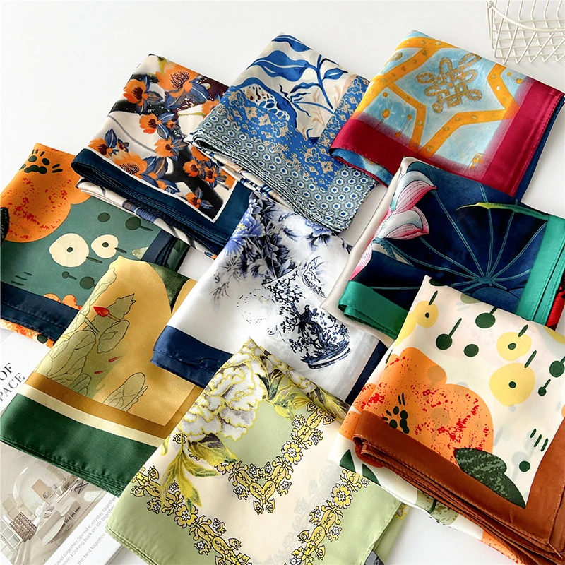 Шелковый шарф в ретро стиле, Женская Бандана с принтом, женский головной платок в полоску с цветами, волнистый шарф, пляжный солнцезащитный шарф