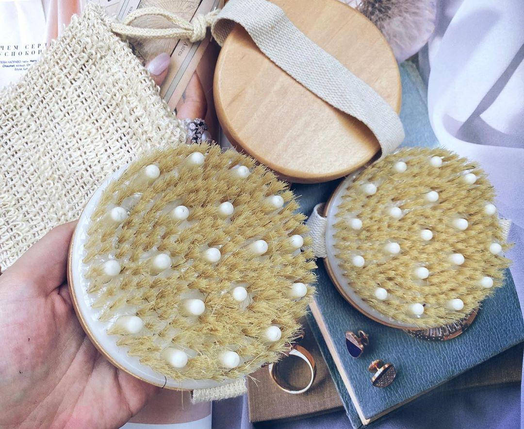 Круглая щётка из натурального волокна (кактус) для сухого массажа в комплекте с мешочком для хранения.
