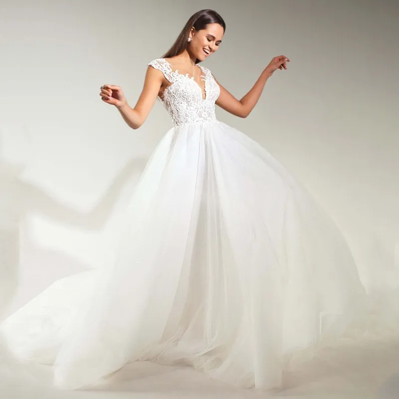 Кружевное Плиссированное свадебное платье-трапеция из тюля с V-образным вырезом, аппликацией бусинами и пуговицами без рукавов