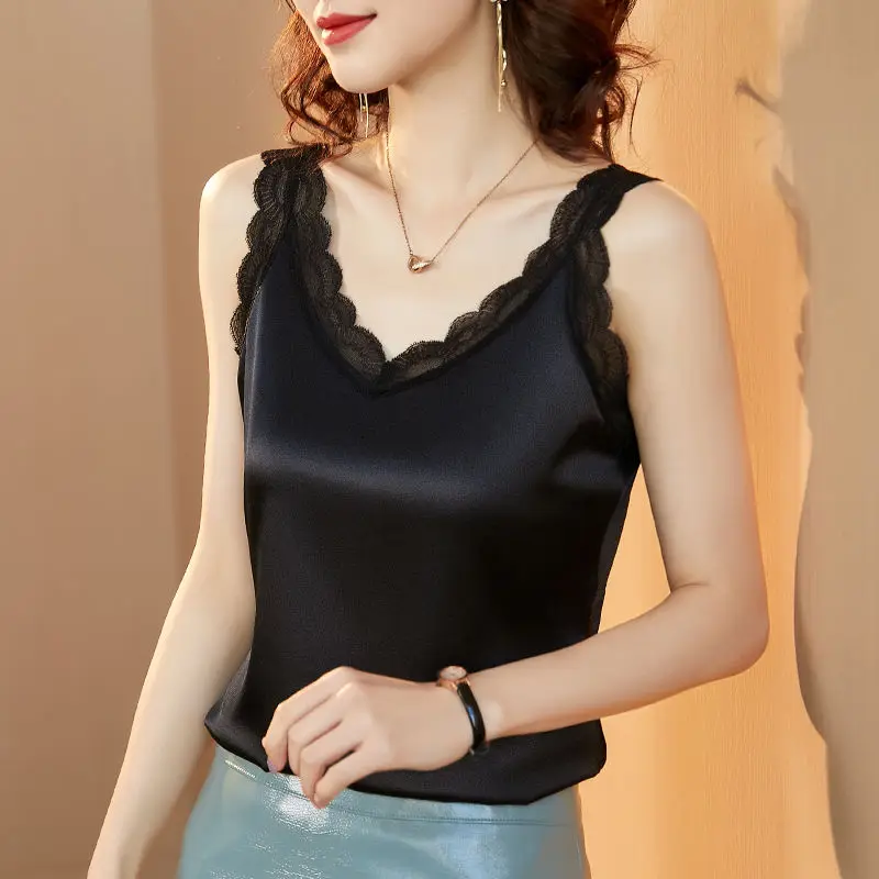 Кружевной Шелковый топ на бретельках, женский сексуальный жилет без рукавов с V-образным вырезом, атласные блузки из искусственного шелка, Ж...