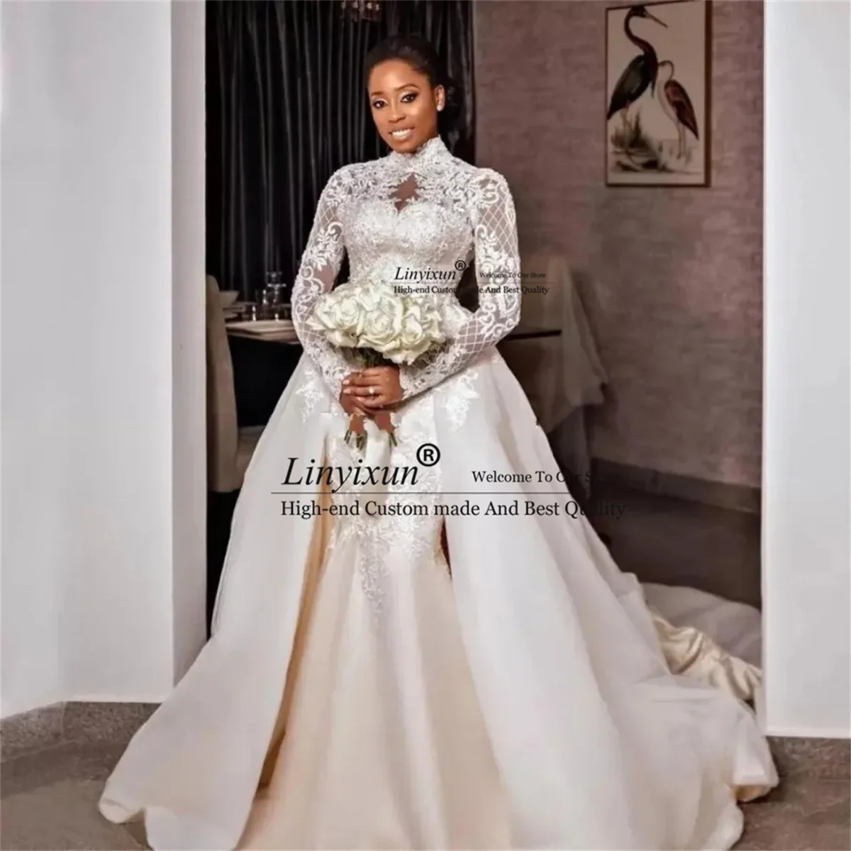 Кружевные свадебные платья а-силуэта, свадебные платья со съемным шлейфом, фатиновое платье невесты с длинным рукавом
