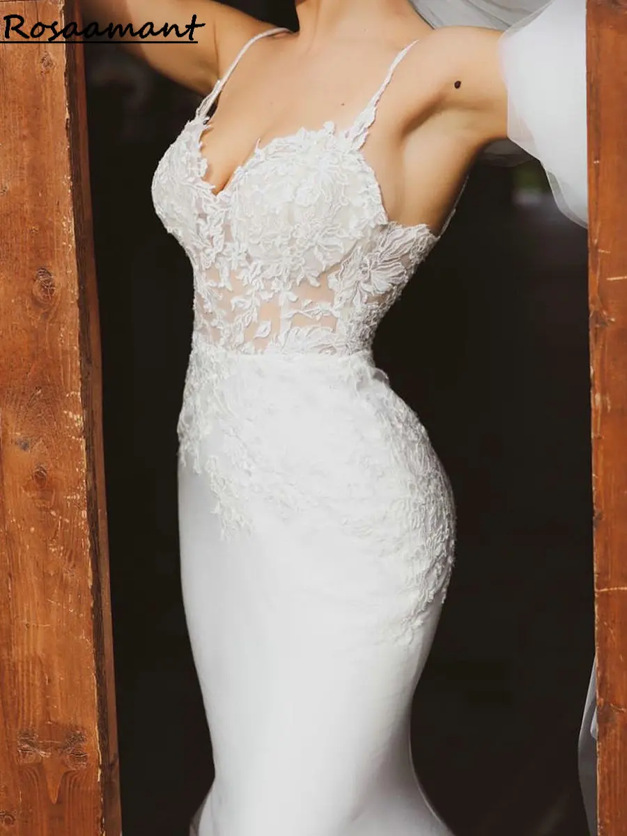 Кружевные свадебные платья-русалки на тонких бретельках с аппликацией