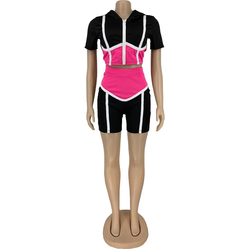Zoctuo Rose Black Patchwork Crop Top Short Set For Women Deep V Neck Hooded Tracksuits Summer Fashion Sexy Skinny Women Set