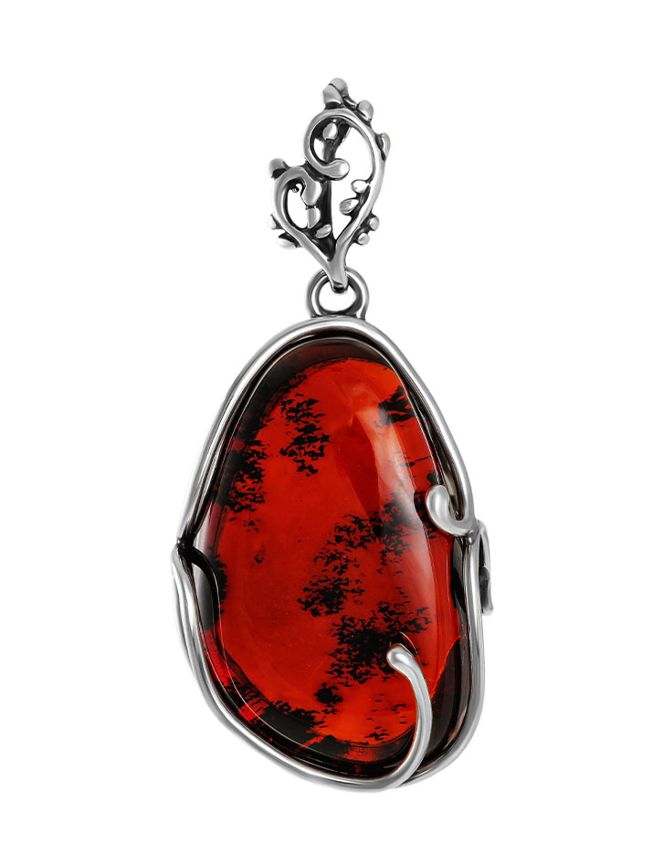 Оригинальный кулон создан художниками-ювелирами из плоского кусочка натурального балтийского янтаря насыщенного вишнёвого цвета. Изящная витая оправа из серебра подчёркивает насыщенный цвет камня и его красивую необычную форму. Подвеску можно носить как в будни, так и в сочетании с праздничным гардеробом.