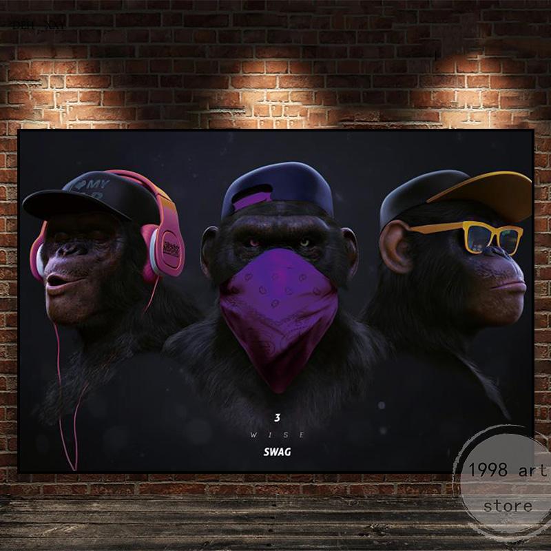 Крутые забавные 3 обезьянки в наушниках и шляпе, постер с изображением животных, картина на холсте, настенная печать, картина для гостиной, домашний декор 50X100cm Unframed