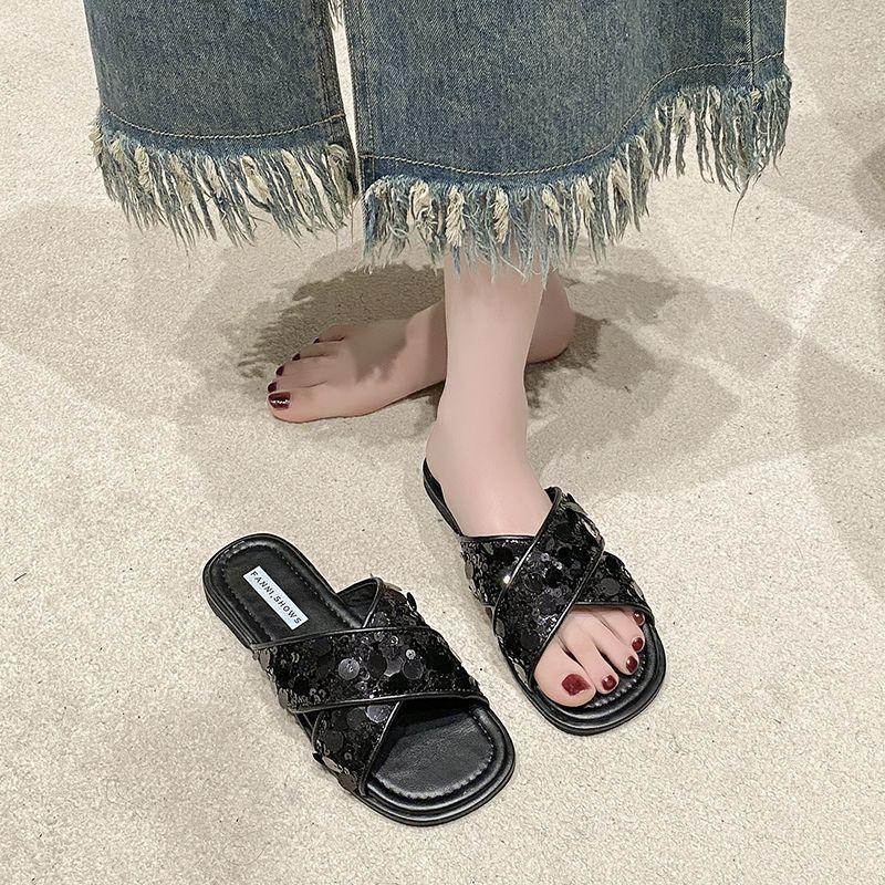 Крутые тапочки женские летние 2025 новинка корейская версия плоская подошва крест интернет-знаменитость тапочки с пайетками мягкая подошва пляжные шлепанцы на перемычке 40 чёрный