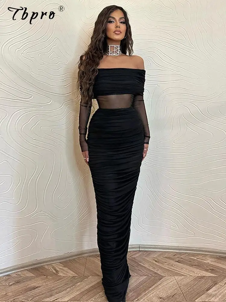 Y2K сексуальное Сетчатое прозрачное плиссированное платье без бретелек женские модные однотонные платья с открытыми плечами и длинным рука...