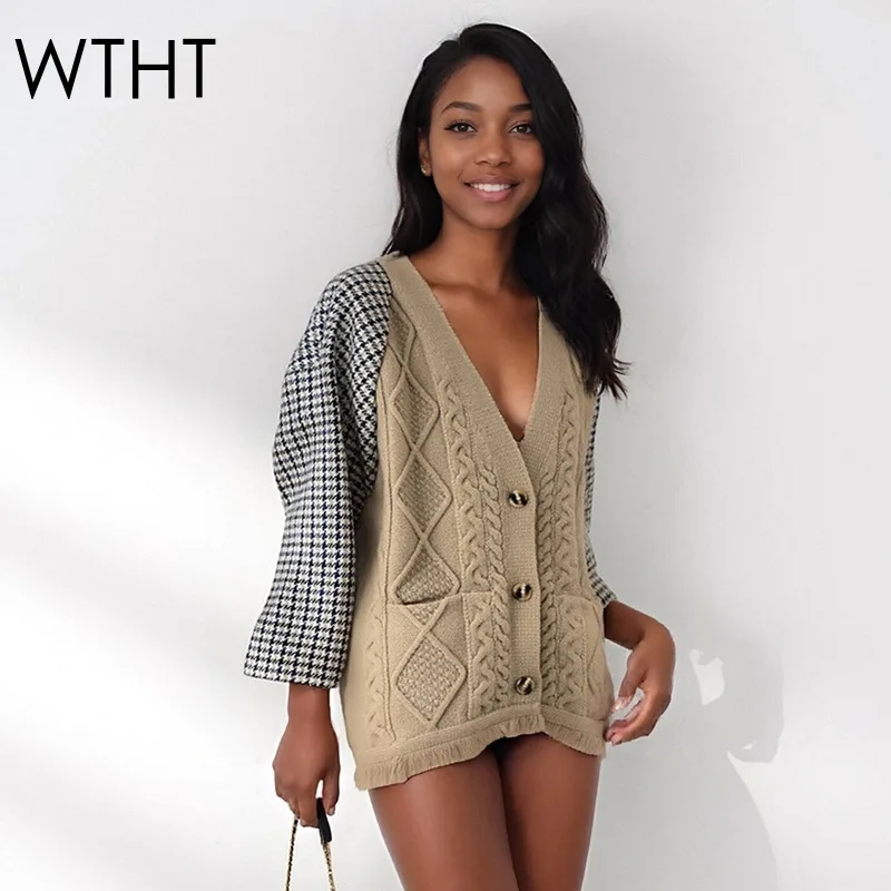 WTHT 2022, осенний модный женский лоскутный клетчатый вязаный кардиган с v-образным вырезом и длинными рукавами, однобортный свитер, женский 1LS2608