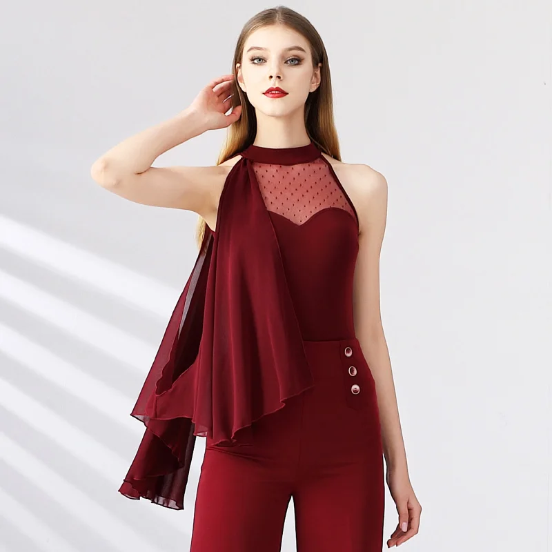 Women Burgundy Red Turtel Neck Sleeveless Ballroom Dance Shirt With Leotards Latin Top Dance Clothes For Rumba Dance Wear