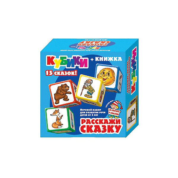 Кубики «Расскажи сказку» предназначены для самых маленьких. В наборе представлено 9 больших красочных кубиков с нанесенными на грани картинками с изображением сказочных персонажей и предметами из сказок, а также книжка со сказками, в которой жирным шрифтом выделены герои и вещи, изображенные на кубиках.