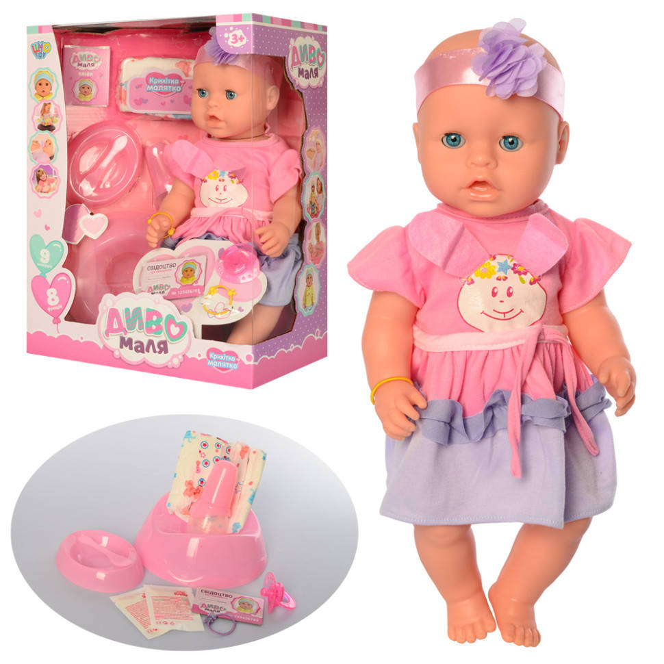 В комплекте: одетый пупс, бутылки для кормления, горшок, тарелка для каши, ложка, смесь-каша, соска, подгузник, ID-свидетельство, браслетик на ручку.