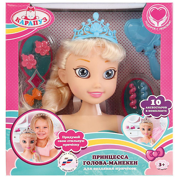 ∙ в наборе: голова-манекен, расческа, 6 заколок, 2 резинки, диадема