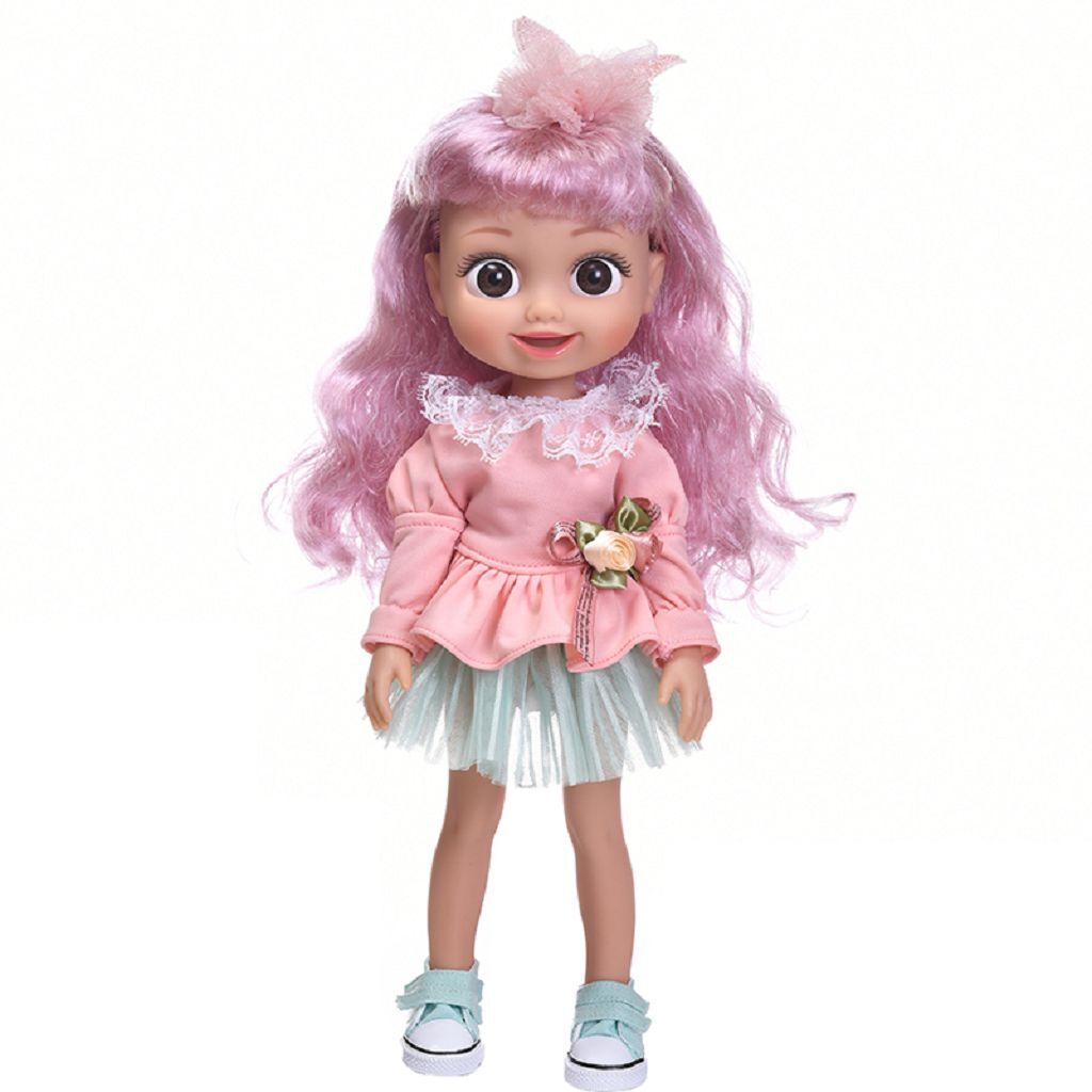 Девочка, полностью виниловая. Все части тела подвижны без анатомических половых признаков. Кукла не ароматизирована. Девочка с длинными розовыми волосами, не парик, прошивка по всей голове. Карие акриловые глазки, с длинными ресницами (глазки закрываются и открываются). Одежда вся снимается. Рост - 36см. Упаковка - пакет (без подарочной коробки). Производитель - Китай.