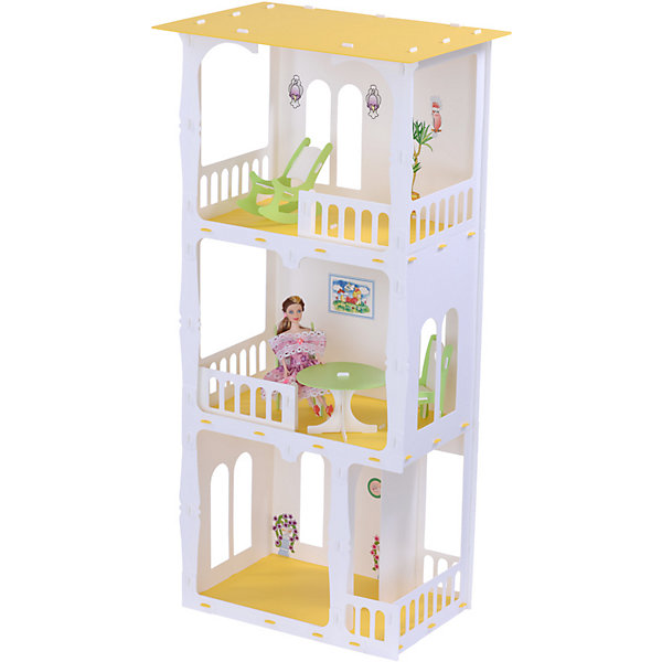 Трёхэтажный кукольный домик бело-жёлтой расцветки легко собирается, удобные замки-защёлки вставляются в отверстия и вынимаются обратно, что позволяет собрать игрушку и взять её с собой куда-угодно. На первом этаже расположен холл, на втором столовая, куда можно поставить стол со стульями, а на третьем этаже расположилась веранда, где можно провести уютные вечера в кресле-качалке. Крыша плоская, множество окон, ограда по периметру. В комплекте есть наклейки, которыми можно декорировать стены внутри и снаружи.