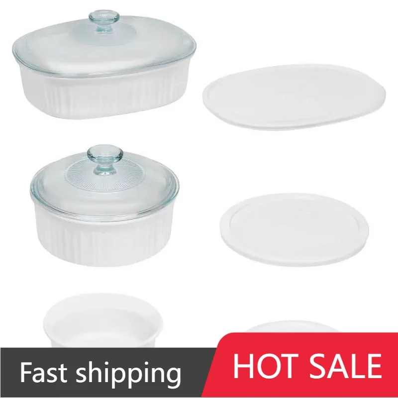 Кукурузная посуда, французский, белый, из 8 предметов, керамический набор со стеклянными и пластиковыми крышками, круглый и Овальный