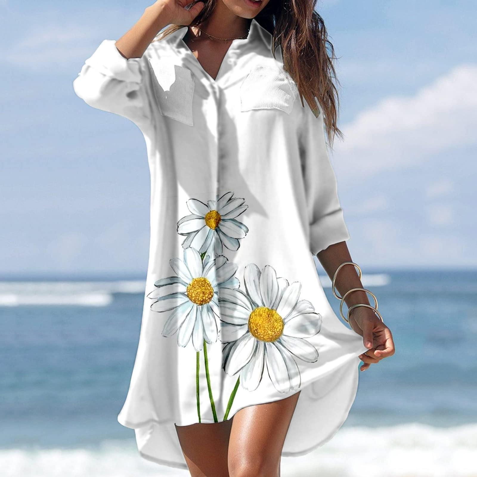 (Куниде) Женское повседневное летнее пляжное платье с карманами и лацканами с длинными рукавами и принтом, топы XXL белый
