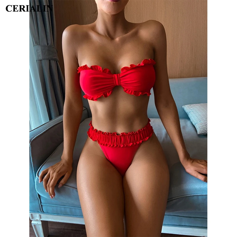Купальник-бикини женский, с открытыми плечами и оборками, с пуш-апом