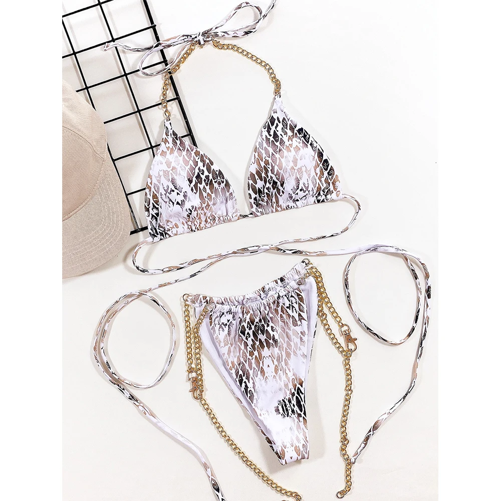 Купальник-бикини со змеиным принтом и металлической цепочкой