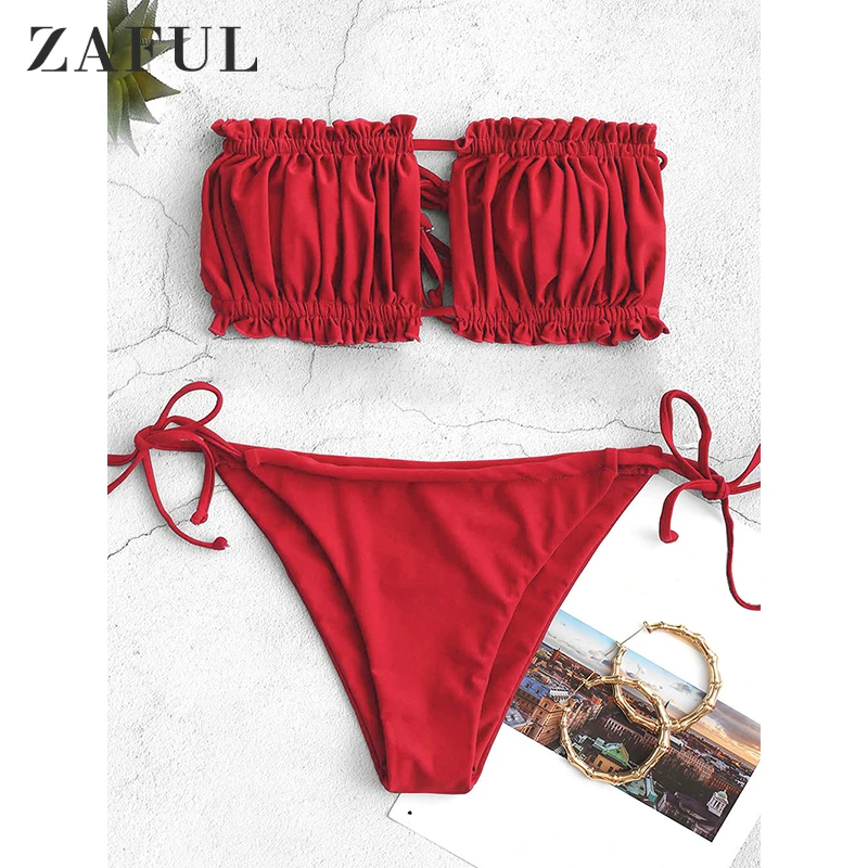 Купальник-бикини с оборками, без бретелек, с завязкой сбоку
