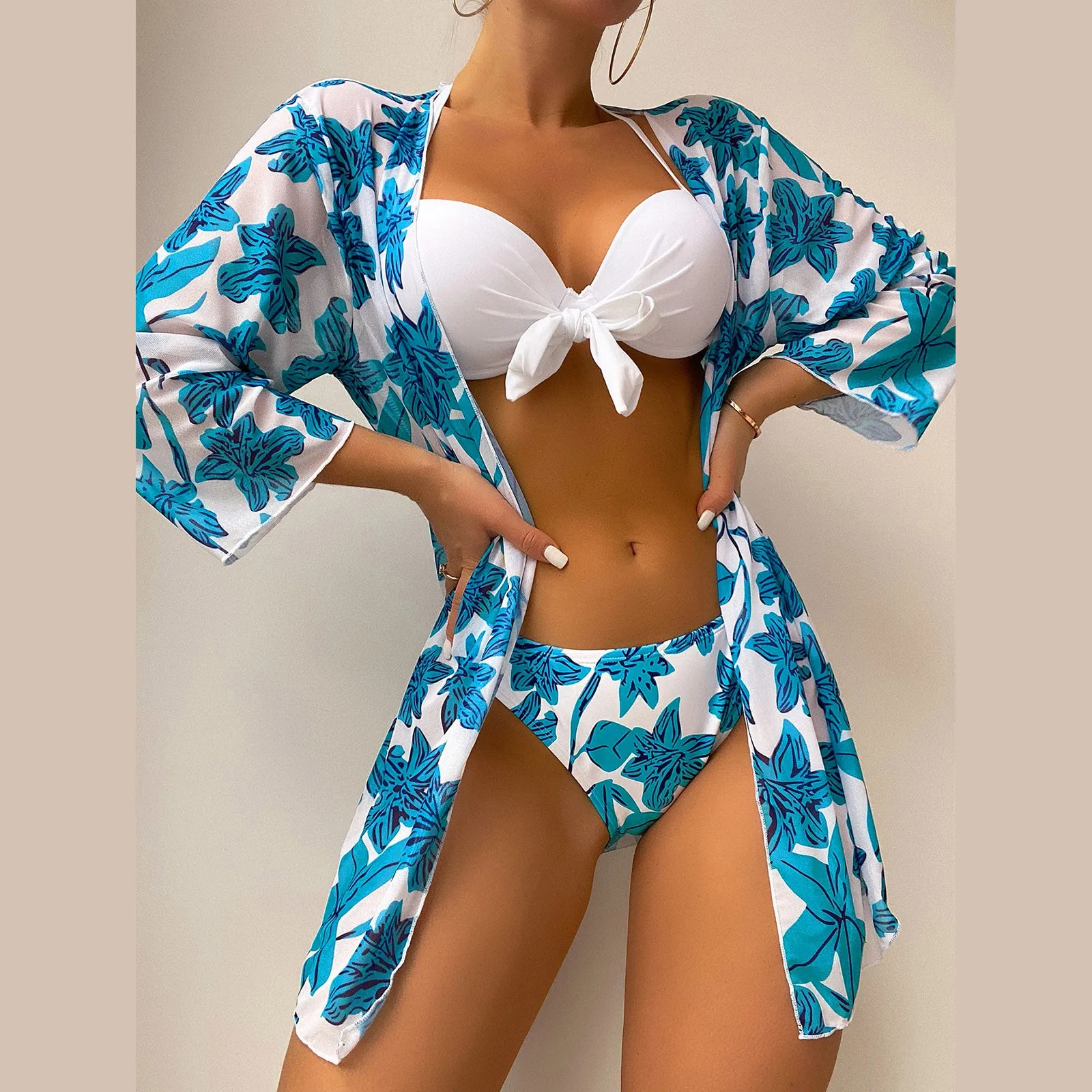 Купальник-бикини с тропическим принтом и накидкой, 3 шт./упаковка