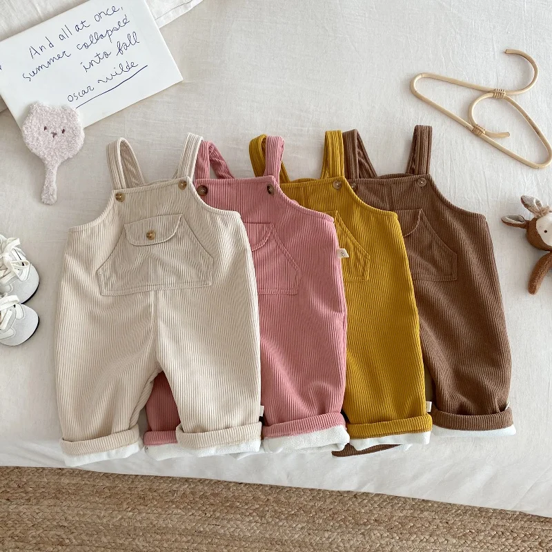 New Winter Kids Fleece Lined Warm Solid Corduroy Toddler Pants Adjustable Straps Boys Girls Long Trousers