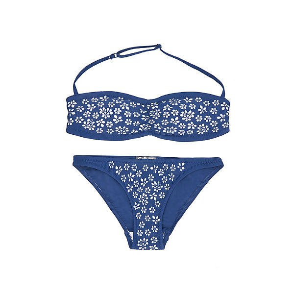 Яркий купальник с цветочным рисунком изготовлен из быстросохнущей ткани. Верхняя часть застёгивается на спинке, а тонкая бретелька через голову дополнена возможностью регулировки.