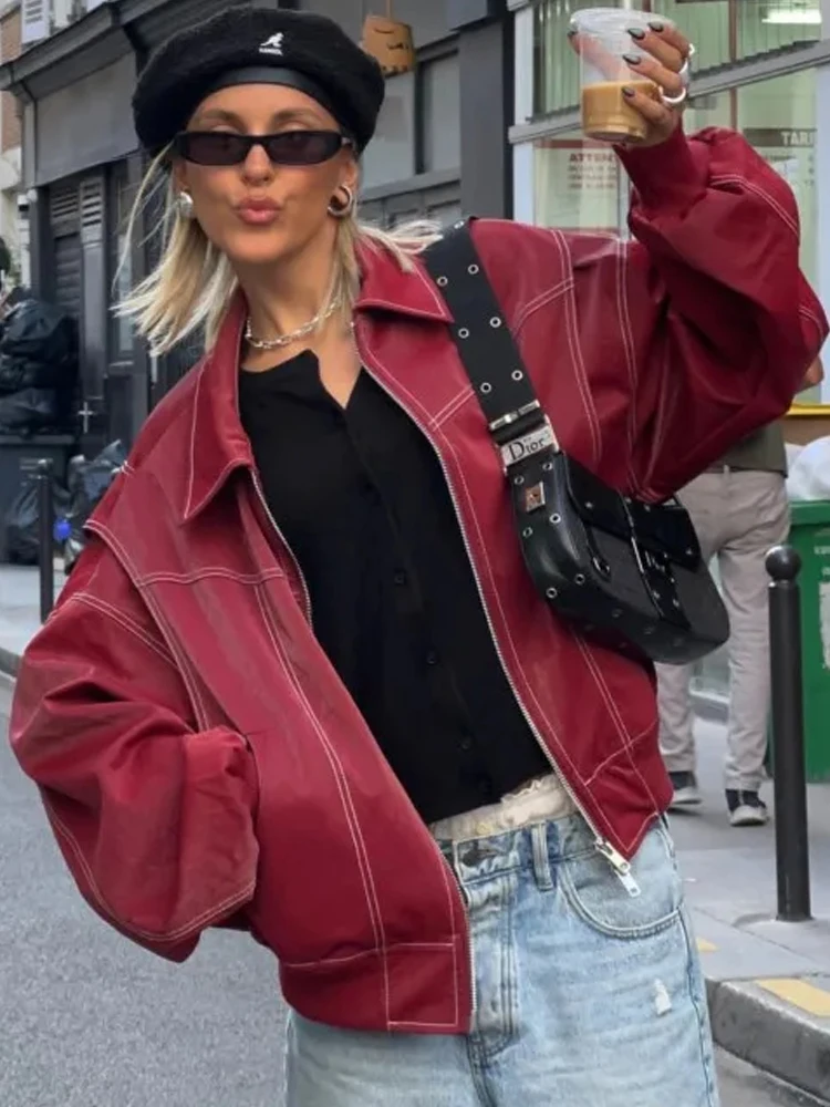 Куртка-бомбер женская демисезонная из ПУ кожи, с отложным воротником