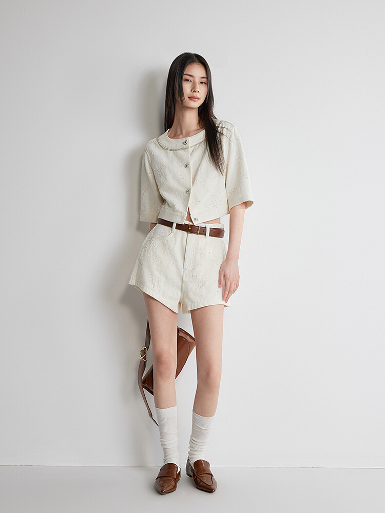Куртка джинсовая Ochirly Ou Shili Xiaoxiang с короткими рукавами, кремовый, Бежевый, Куртка джинсовая Ochirly Ou Shili Xiaoxiang с короткими рукавами, кремовый