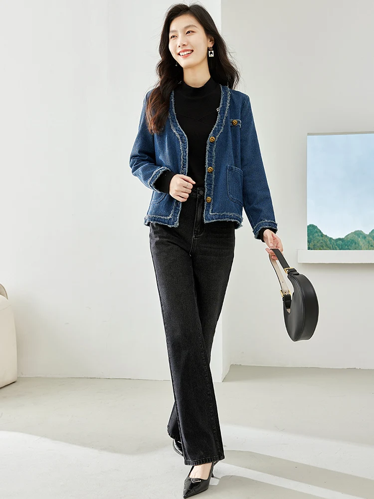 Куртка женская джинсовая прямая свободного покроя с V-образным вырезом и длинным рукавом