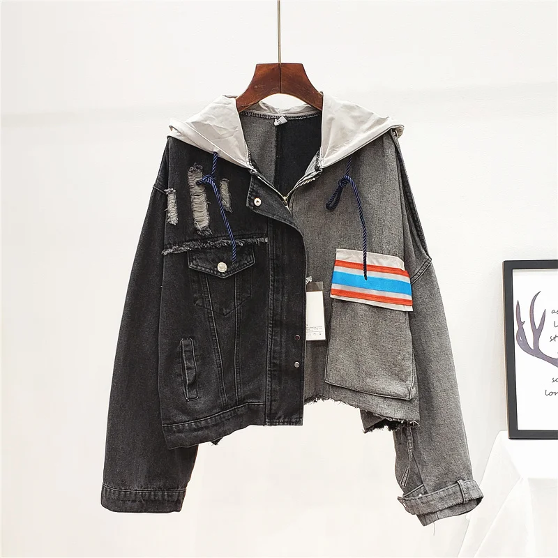 Куртка женская джинсовая с капюшоном, рваная уличная одежда с принтом в стиле пэчворк, короткий свободный крой, с рукавом летучая мышь, повседневная верхняя одежда, осень