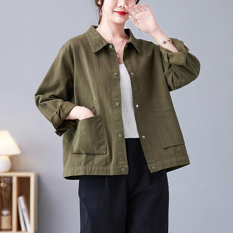 Куртка женская осенняя короткая повседневная куртка на пуговицах свободные простые топы большого размера с длинными рукавами плюс размер S зелёный