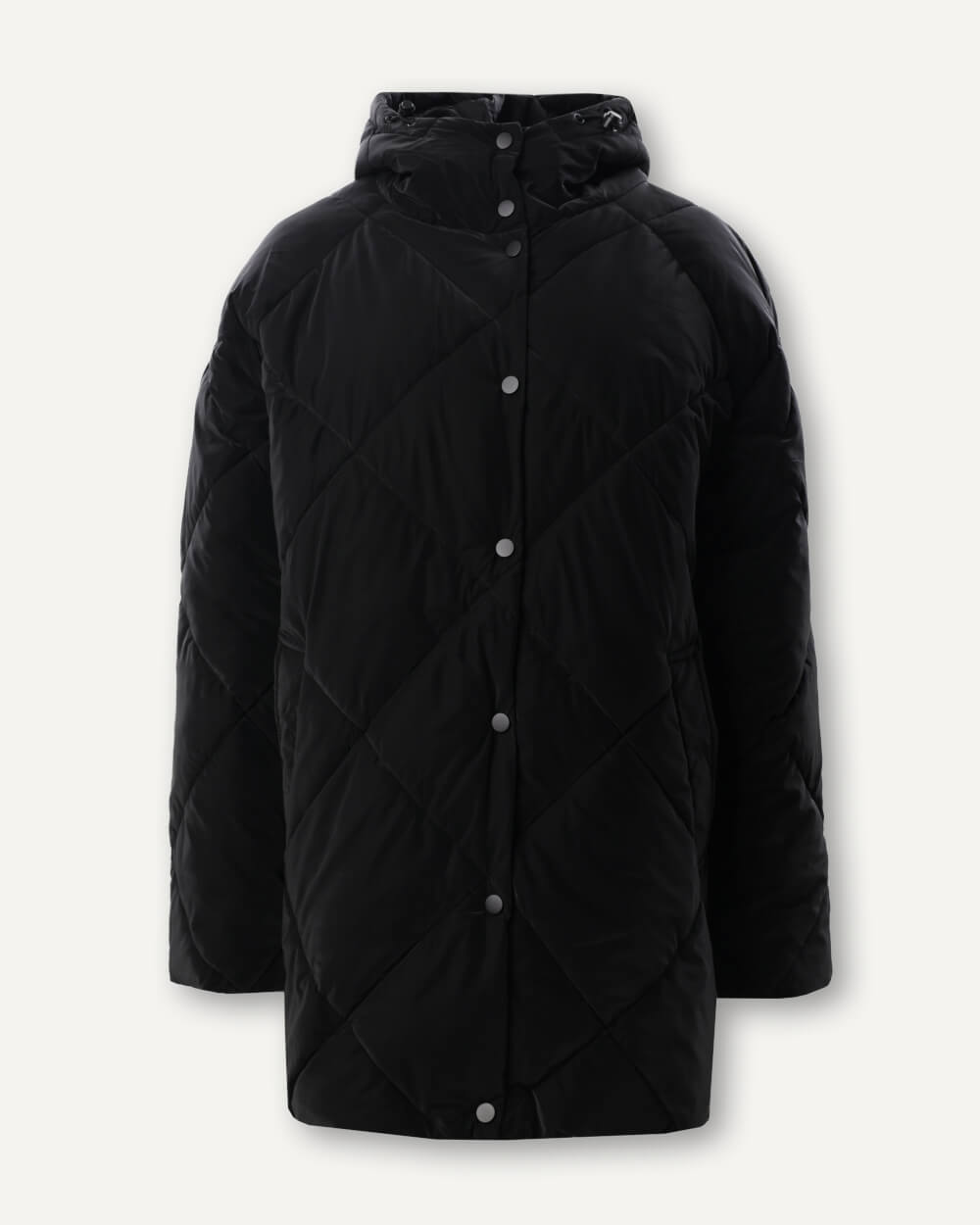 Черная стеганая куртка прямого кроя. Модель с длинными рукавами и капюшоном. Спереди застежка на пуговицы-кнопки.