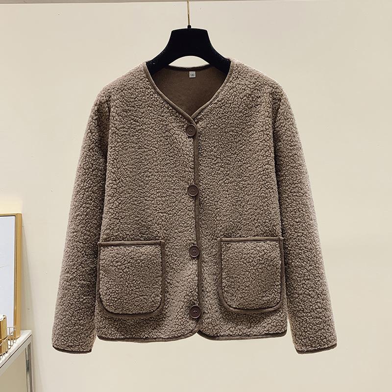 Куртка из гранулированного флиса для женщин, осень и зима, короткая повседневная куртка с интегрированным мехом из овечьей шерсти, модная зимняя теплая куртка с цветными блоками 5XL коричневый