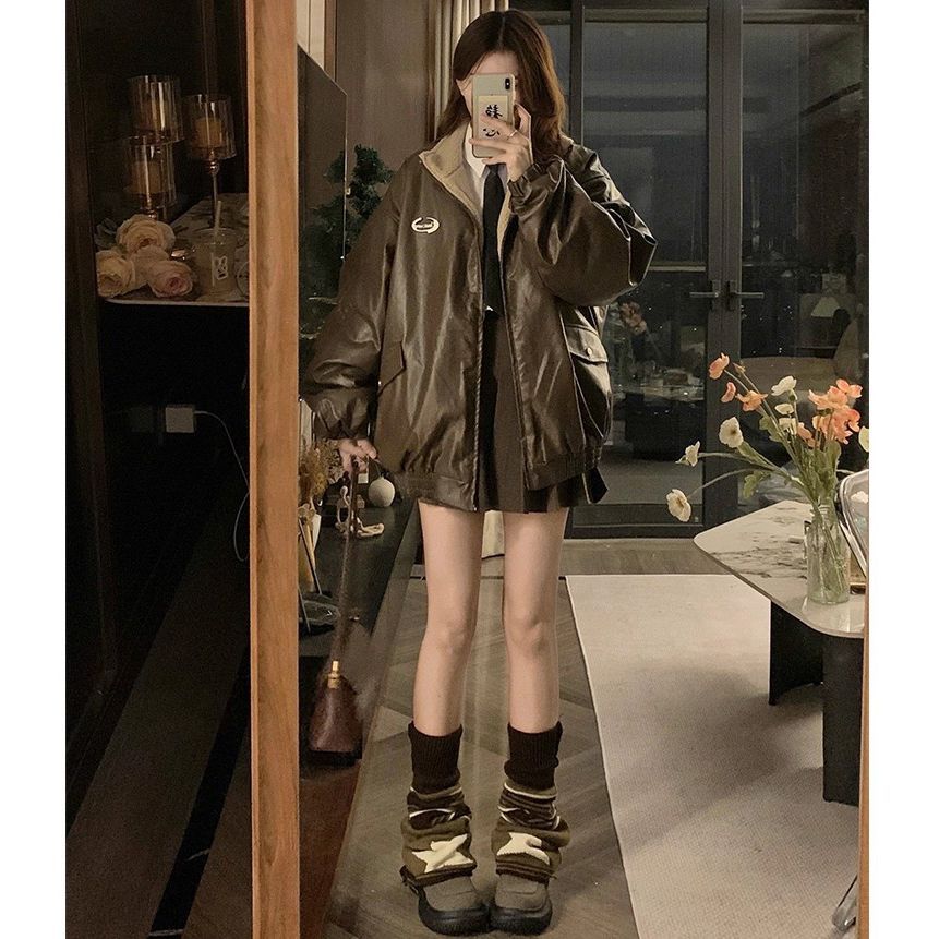 Куртка из искусственной кожи, Двусторонняя куртка из овечьей шерсти, Женская осенне-зимняя утолщенная мотоциклетная хлопковая куртка с плюшевой подкладкой XS кофейный