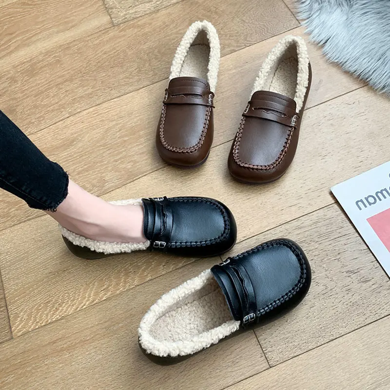 Туфли женские на платформе, мягкие кроссовки, без шнуровки, платформа, лоферы, мех, низкий каблук, Классическая обувь, без застежки, зимние сл...