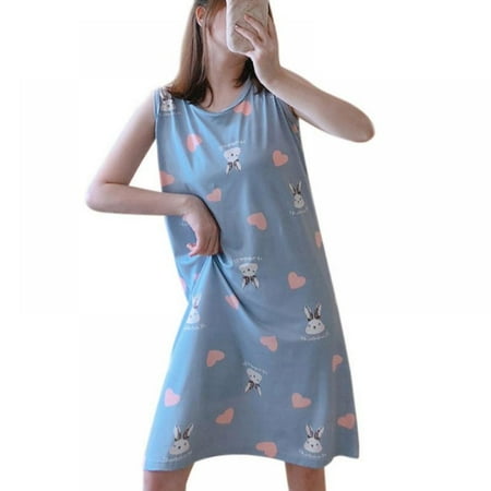 Women Sleevess Night Dress Milk Shreds Cartoon Home Clothers Sweat Vest Skirt Plus Size M-2XXL Blue