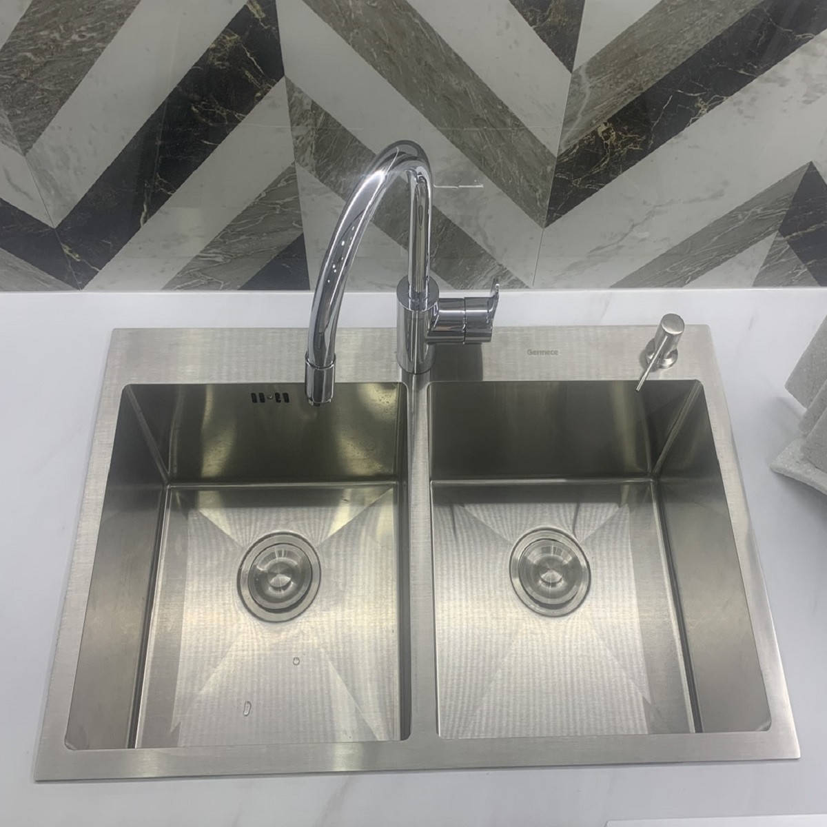 Описание: Двойная кухонная мойка из стали 3.0 и 1.2 мм Platinum Handmade 78*48/220. Равные чаши. Дополнительная корзина и дозатор для моющего в комплекте.
