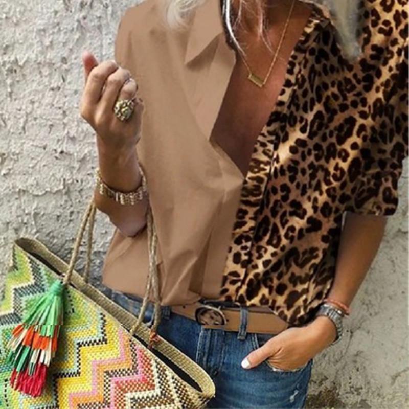 Shirts Patchwork Leopard Print Women Blouse Shirt Autumn V Neck Sexy Lapel Contrast Female Long Sleeve Shirt Casual Buttons Lady Tops, Sky blue