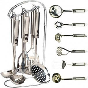 Торговая марка: Maestro Количество предметов: 7 Набор состоит из: лопатка, картофелемялка, половник, шумовка, подставка, ложка для спагетти, соусник Удобство в использовании Современный элегантный дизайн Высококачественная нержавеющая сталь