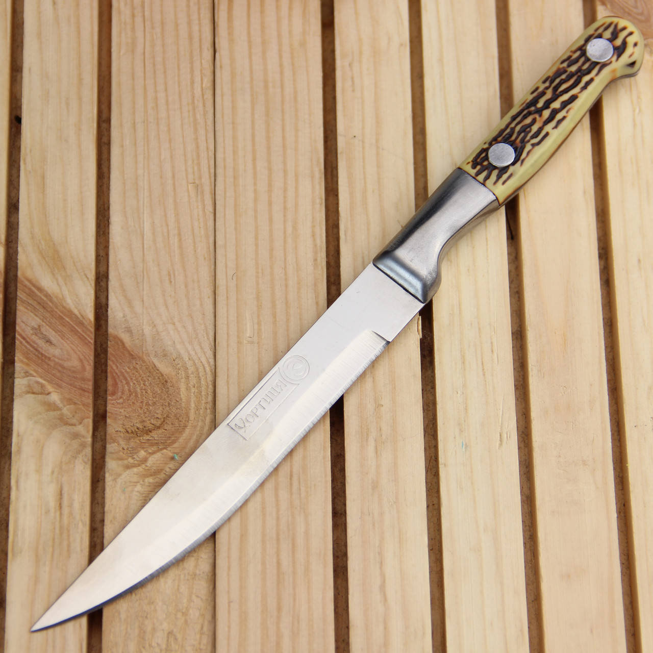 Кухонный нож Хортица - качественный универсальный кухонный нож, который можно использовать в процессе приготовления пищи. Нож прекрасно справится с любой задачей на кухне. Разделка мяса, нарезание овощей и фруктов - с ножом Хортица не проблема. Лезвие ножа изготовлено из нержавеющей стали. Рукоять ножа прочная, имеет оригинальный дизайн и выполнен под кость.