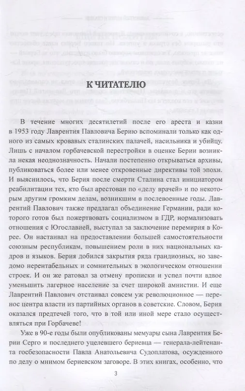 В течение многих десятилетий после его ареста и казни в 1953 году Лаврентия Павловича Берию вспоминали только как одного из самых кровавых сталинских палачей. Лишь с началом перестройки в оценке Берии возникла некая неоднозначность. Выяснилось, что Берия после смерти Сталина стал инициатором реабилитации тех, кто был арестован по "делу врачей" и по некоторым другим громким делам, возникшим в послевоенные годы. Лаврентий Павлович также предлагал объединение Германии, ради которого готов был пожертвовать социализмом в ГДР, нормализовать отношения с Югославией, выступал за заключение перемирия в Корее. Он настаивал на предоставлении большей самостоятельности союзным республикам, повышении роли в них национальных кадров и языков. Берия добился закрытия ряда грандиозных, но заведомо нерентабельных и сомнительных в экологическом отношении строек. И он же ратовал за отмену прописки и успел почти вдвое уменьшить лагерное население за счет широкой амнистии. И еще Лаврентий Павлович отстаивал совсем уж революционное - перенос центра власти из партийных органов в советские…