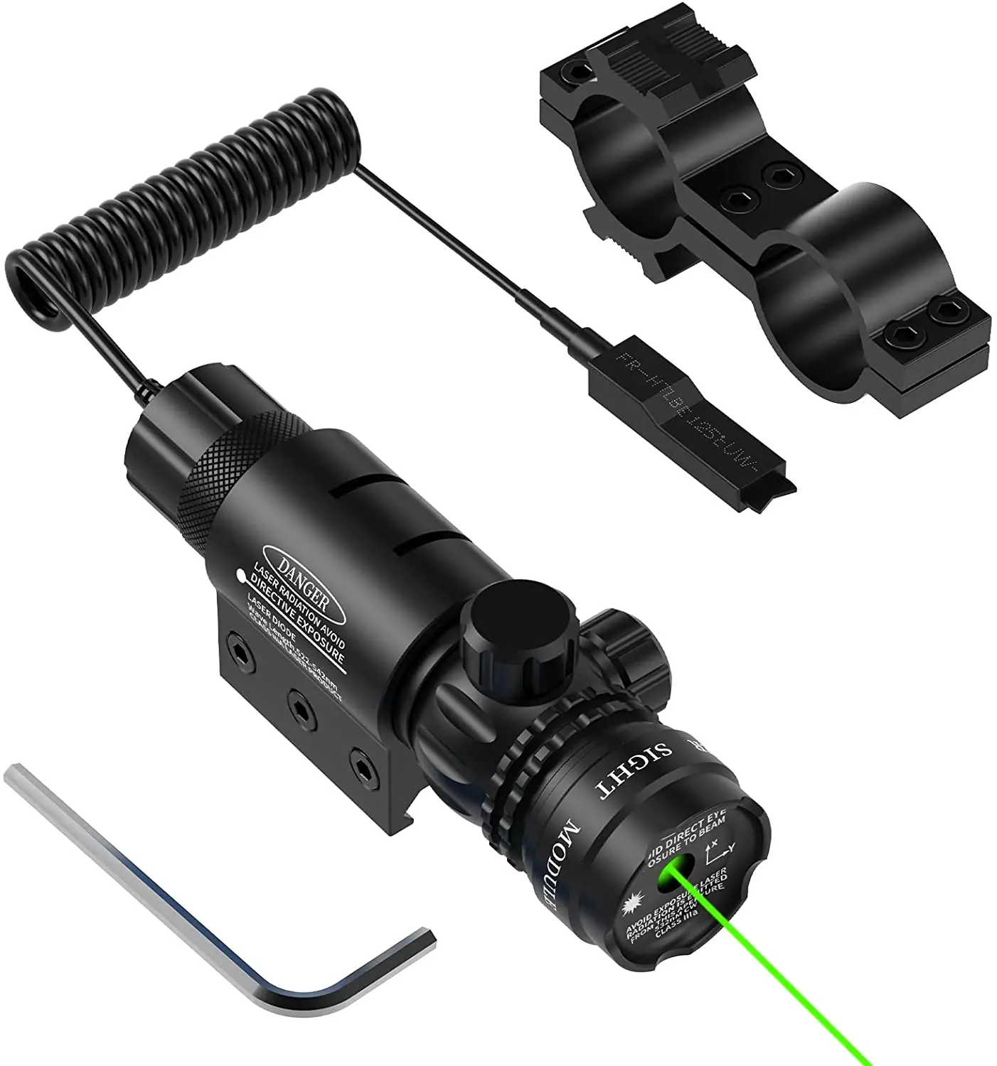 Лазерный прицел с зеленой точкой, 532нм, прицел с 20-миллиметровым креплением Пикатинни и 1 дюймовым кольцевым адаптером, дистанционный переключатель давления