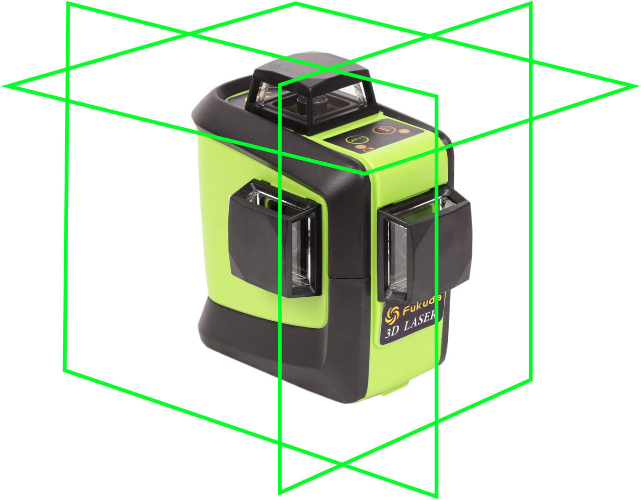 Fukuda 3D-LASER обновленная модель MW-93T-1-3GX GREEN — это профессиональный самовыравнивающийся лазерный уровень с зеленым лучом, проецирующий 3 замкнутые плоскости, 2 из которых вертикальные и одна горизонтальная (12 линий). Вертикальные плоскости образуют угол в 90°. Зеленые лучи видно гораздо лучше красных, особенно это видно это тогда, когда много солнечного света или в помещении очень хорошее освещение, например, светодиодное.
