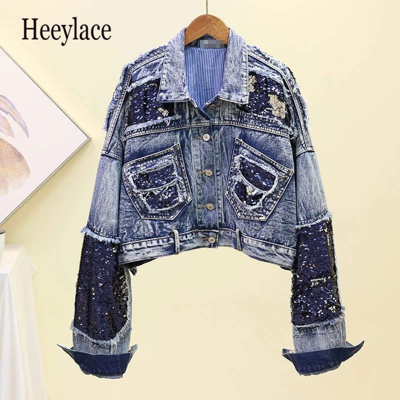 Женская синяя джинсовая куртка с блестками harajuku на осень 2020, рваные шикарные джинсы, расшиты блестками k = куртки, базовое короткое пальто для студентов