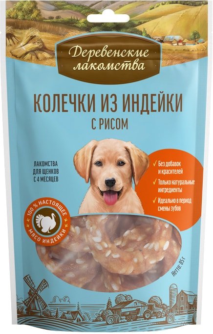 Лакомство для собак Деревенские лакомства Колечки из индейки с рисом для щенков 85 г