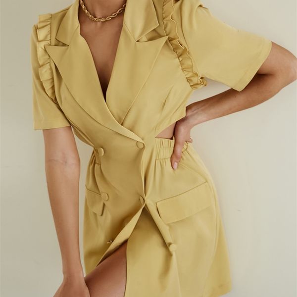 berrygo fashion hollow out ruffle short sleeve blazer dress women fashion v-neck button work mini dress solid summer vestidos 220516, Black;gray