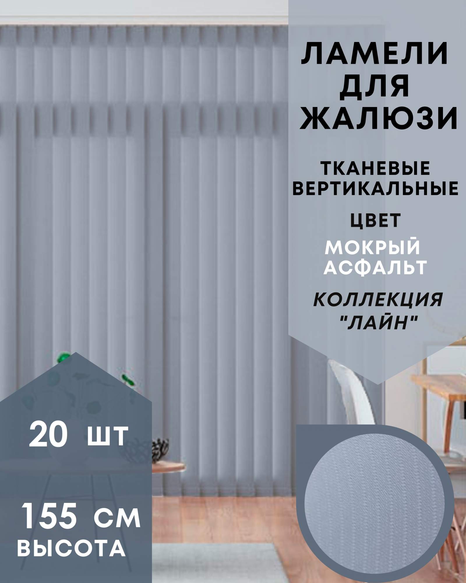 Ламели для вертикальных жалюзи Лайн 20шт длиной 155см, мокрый асфальт (без карниза), Серый, Ламели для вертикальных жалюзи Лайн - 1
